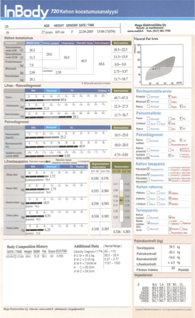 InBody-mittauksella saat nopeasti (noin 2 min.), luotettavasti ja helposti yksityiskohtaista tietoa kehosi koostumuksesta. Kehonkoostumusmittauksen kirjallinen raportti ja henkilökohtainen palaute toimivat erinomaisena työvälineenä mm. yksilön motivoinnissa kohti terveellisempää elämäntapaa. Kehonkoostumusmittauksen tulosten avulla voidaan esim. painonpudotuksen seurannassa varmistaa luodun ohjelman toimivuus, jolloin kehosta häviää nimenomaan rasvaa, ei lihaksia. Käyttämämme laite InBody 720 on terveysalan ammattilaisten käyttöön suunniteltu.